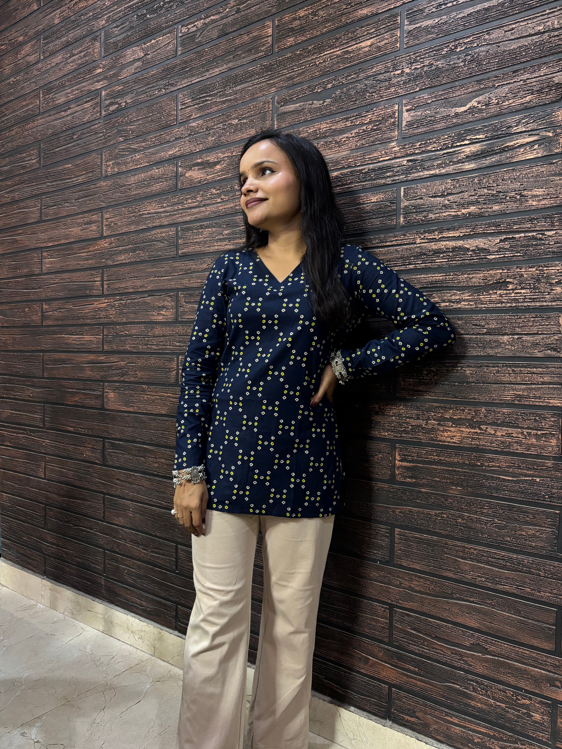 Elevate your everyday style with Sonaira’s Bandhani Straight Full Sleeves Short Kurti in a stunning navy blue hue. Adorned with white and yellow block patterns, this kurti blends traditional charm with a modern edge. Crafted from soft, breathable fabric, it offers ultimate comfort while keeping you looking effortlessly chic and elegant. Perfect for casual outings, festive get-togethers, or a stylish workday look — this versatile piece is a wardrobe essential!