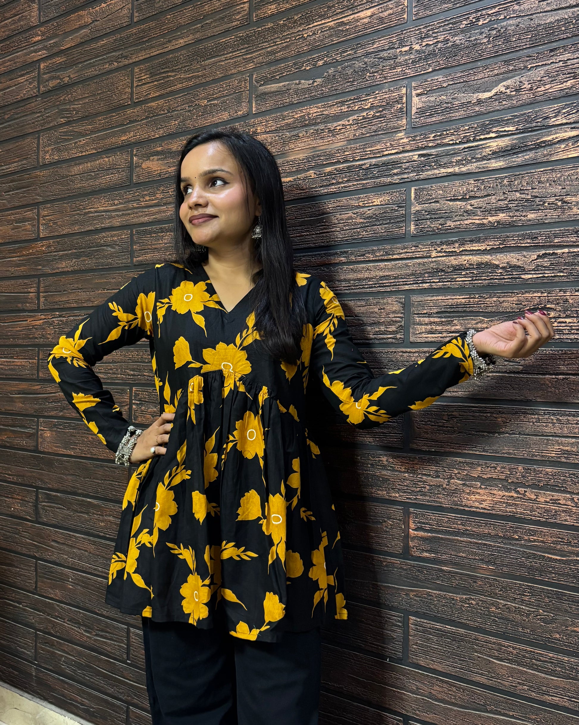 Step into effortless elegance with our Black and Floral Yellow Peplum Short Kurti from Sonaira. Crafted in soft and breathable pure cotton, this kurti blends comfort with style. The charming yellow floral print on a black base adds a fresh yet timeless touch, while the V-neckline and peplum silhouette create a flattering and feminine look. Designed with full sleeves, it’s the perfect pick for the fall season — stylish, cozy, and versatile.